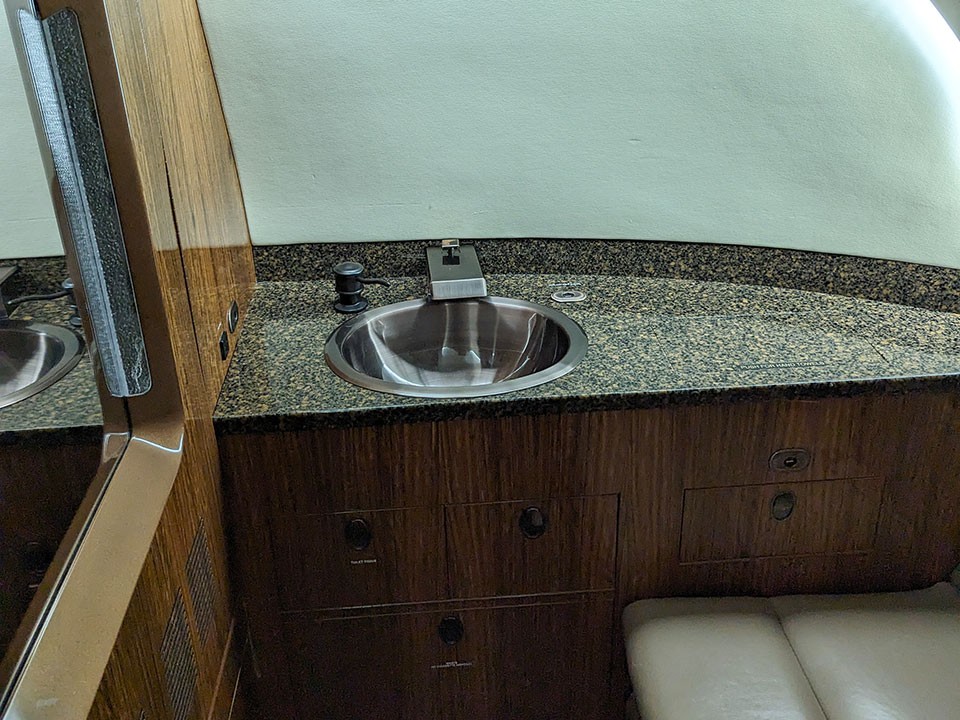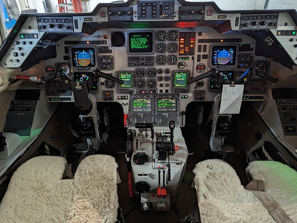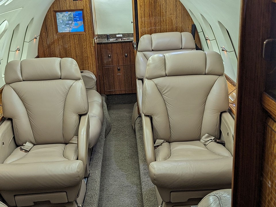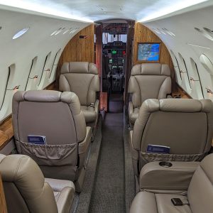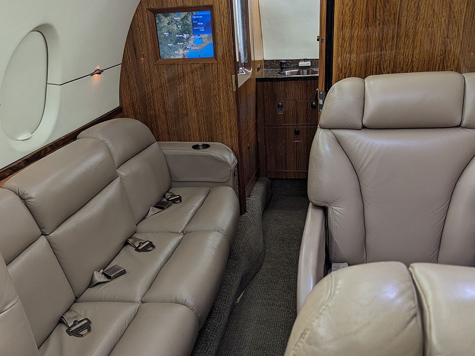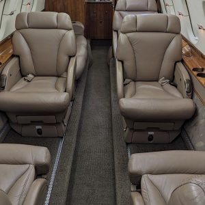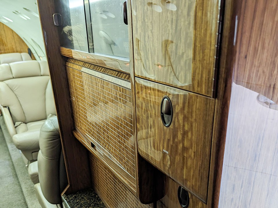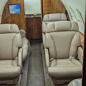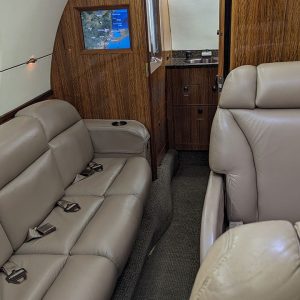 Eight passenger interior consisting of forward four-place club, aft three-place divan, forward facing chair and aft belted lav seat. Medium High-gloss wood finish with Nickel Plated Fixtures. Gally has TIA Microwave, MAPCO’s and an Ice Chest. Cabin entertainment includes Forward and Aft 17” monitors and a Flight Displays Blu-Ray DVD/CD Player. Cabin has 110v outlets, USB Ports and Audio in port. (Partial refurb November 2016)