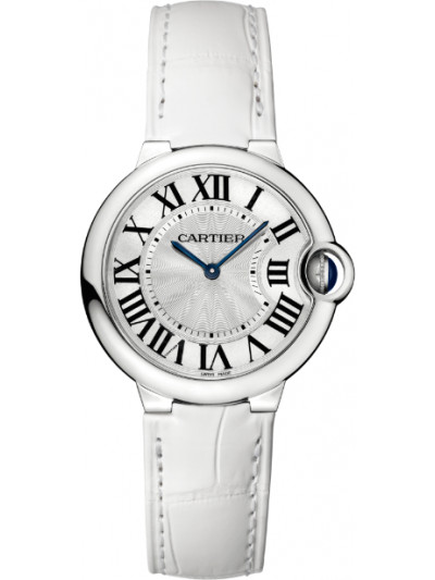 Ballon Bleu de Cartier watch, 36 mm, quartz movement. Steel case, fluted crown set with a synthetic spinel cabochon, silvered guilloché opaline dial, Roman numerals, blued-steel sword-shaped hands, sapphire crystal, alligator-skin strap, double adjustable folding steel buckle. Case dimensions: diameter: 36.6 mm, thickness: 12.05 mm. Water-resistant to 30 meters/100 feet.