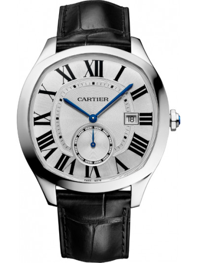 Drive de Cartier watch, Manufacture self-winding mechanical movement, caliber 1904-PS MC. Steel case, length: 40 mm, width: 41 mm, thickness: 11.25 mm, octagonal steel crown set with a faceted synthetic spinel. Silvered flinqué dial, Roman numerals, blued-steel leaf-shaped second hand, blued-steel sword-shaped hour and minute hands. Sapphire crystal. Black semi-matte alligator skin strap, 18 mm steel double adjustable folding buckle. Calendar aperture at 3 o’clock, small seconds counter at 6 o’clock, sapphire case back. Water-resistant to 3 bar (approx. 30 meters/100 feet).