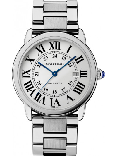 Ronde Solo de Cartier watch, 42 mm, mechanical movement with automatic winding. Steel case, beaded crown set with a synthetic cabochon-shaped spinel, silvered opaline dial, blued-steel sword-shaped hands, sapphire crystal, steel bracelet, calendar aperture at 3 o’clock. Thickness: 8.53 mm. Water-resistant to 3 bar (approx. 30 meters/100 feet).