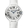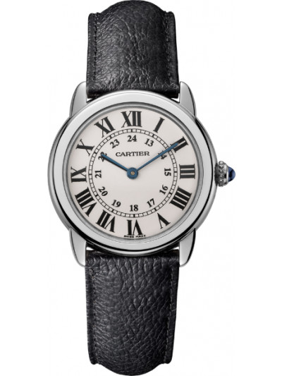 Ronde Solo de Cartier watch, 29 mm, quartz movement. Steel case, beaded crown set with a synthetic cabochon-shaped spinel, silvered light opaline dial, blued-steel sword-shaped hands, sapphire crystal, black grained calfskin interchangeable strap, steel double adjustable folding buckle. Case thickness: 6.35 mm. Water-resistant to 3 bar (approx. 30 meters/100 feet).