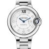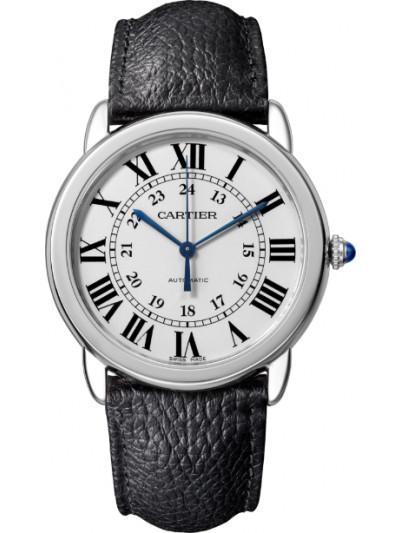 Ronde Solo de Cartier watch, 36 mm, mechanical movement with automatic winding. Steel case, beaded steel crown set with a synthetic cabochon-shaped spinel, silvered opaline dial, blued-steel sword-shaped hands, sapphire crystal, black grained calfskin interchangeable strap, steel double adjustable folding buckle. Case thickness: 9.46 mm. Water-resistant to 3 bar (approx. 30 meters/100 feet).