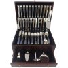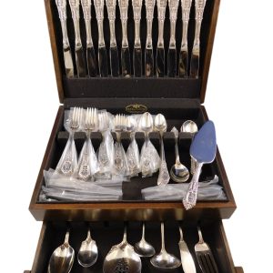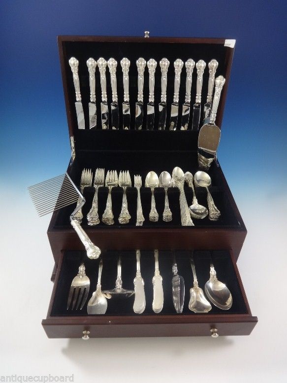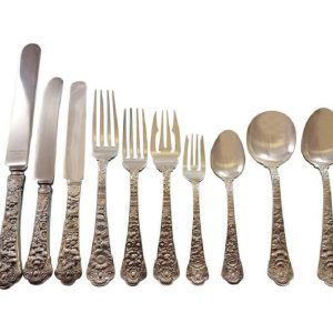 Finely crafted with the graceful elegance associated with 18th Century France, this stately pattern was first introduced in 1895. The intricate design is embellished with a cascade of deeply carved borders showcasing a slender raised central panel along the handle and a more substantial open panel that can be monogrammed near the tip, which is crowned with a delicate fleur de lis. A stunning addition to traditional and formal interiors, this regal pattern will turn every meal into an event. This is one of the most popular silver patterns of all timeHuge Chantilly By Gorham sterling silver Flatware set – 104 Pieces. This set includes